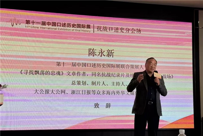 值此中国人民抗日战争暨世界反法西斯战争胜利80周年之际,诸暨远征大酒店作为首次中国口述历史国际展·抗战口述史指定的分会场,第十一届中国口述历史国际展联合策展人、诸暨远征大酒店董事长,《寻找飘荡的忠魂》文章作者、同名抗战纪录片及续集《重返缅甸战场》制片人陈永新先生对到场的学界同仁、文史研究者、记忆传承者及各界项目代表表示热烈欢迎并发表了精彩致辞。他表示,第十一届中国口述历史国际展分会场能设在诸暨远征大酒店深感自豪,同时,不敢辜负,不敢懈怠。
